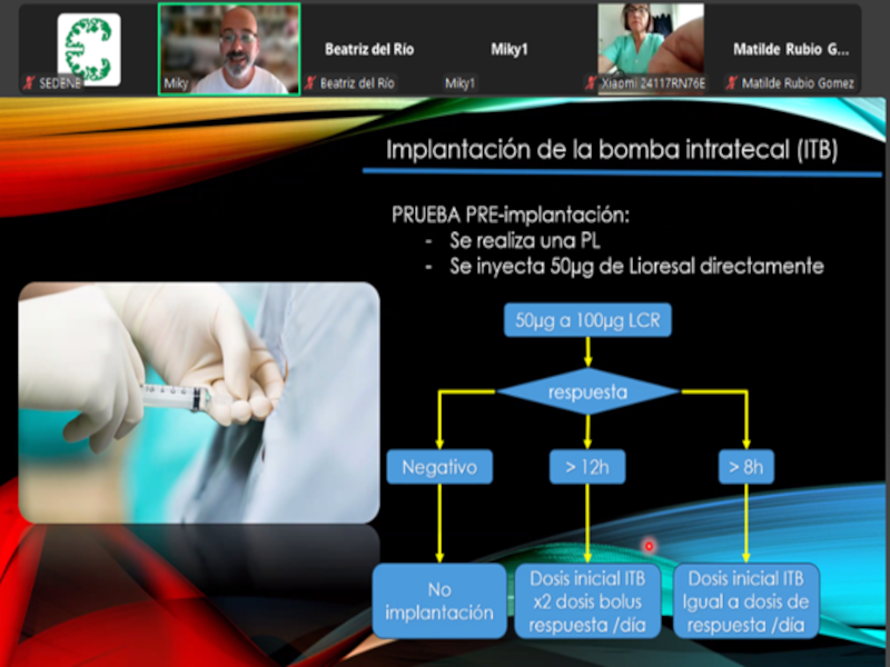 Durante su intervención, se abordó el uso de la bomba de baclofeno intratecal (ITB) en pacientes con EM con espasticidad severa: una opción terapéutica avanzada que permite una administración personalizada, continua y eficaz del tratamiento, mejorando notablemente la funcionalidad y calidad de vida de estos pacientes. Esta técnica, además, minimiza efectos secundarios y optimiza el proceso de rehabilitación, previniendo complicaciones musculoesqueléticas.